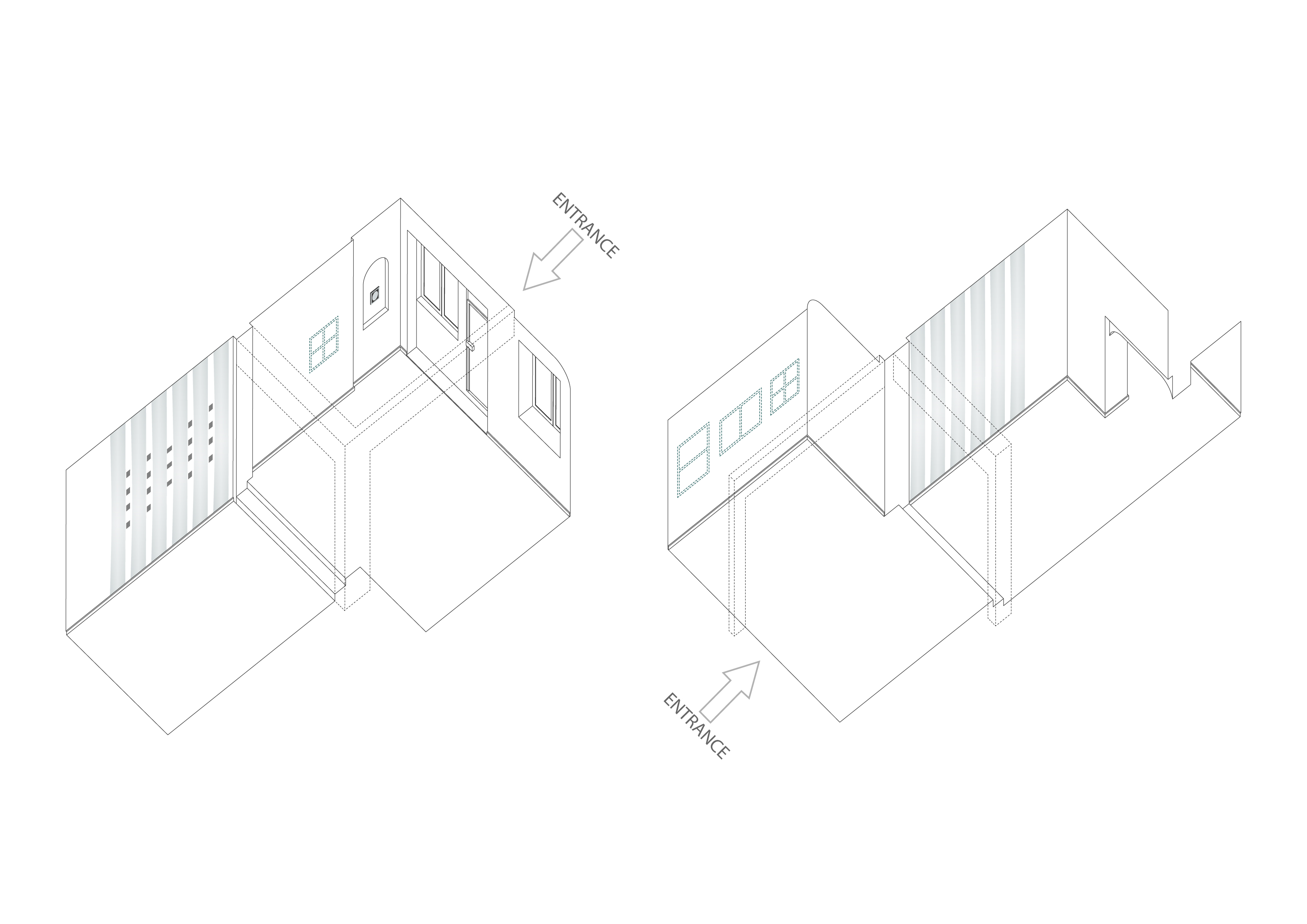 - Luca Longagnani, Axonometric rendering of Carla Accardi’s exhibition Origine at Via Beato Angelico 18 in Rome, 2020, rendering created specifically for this article.